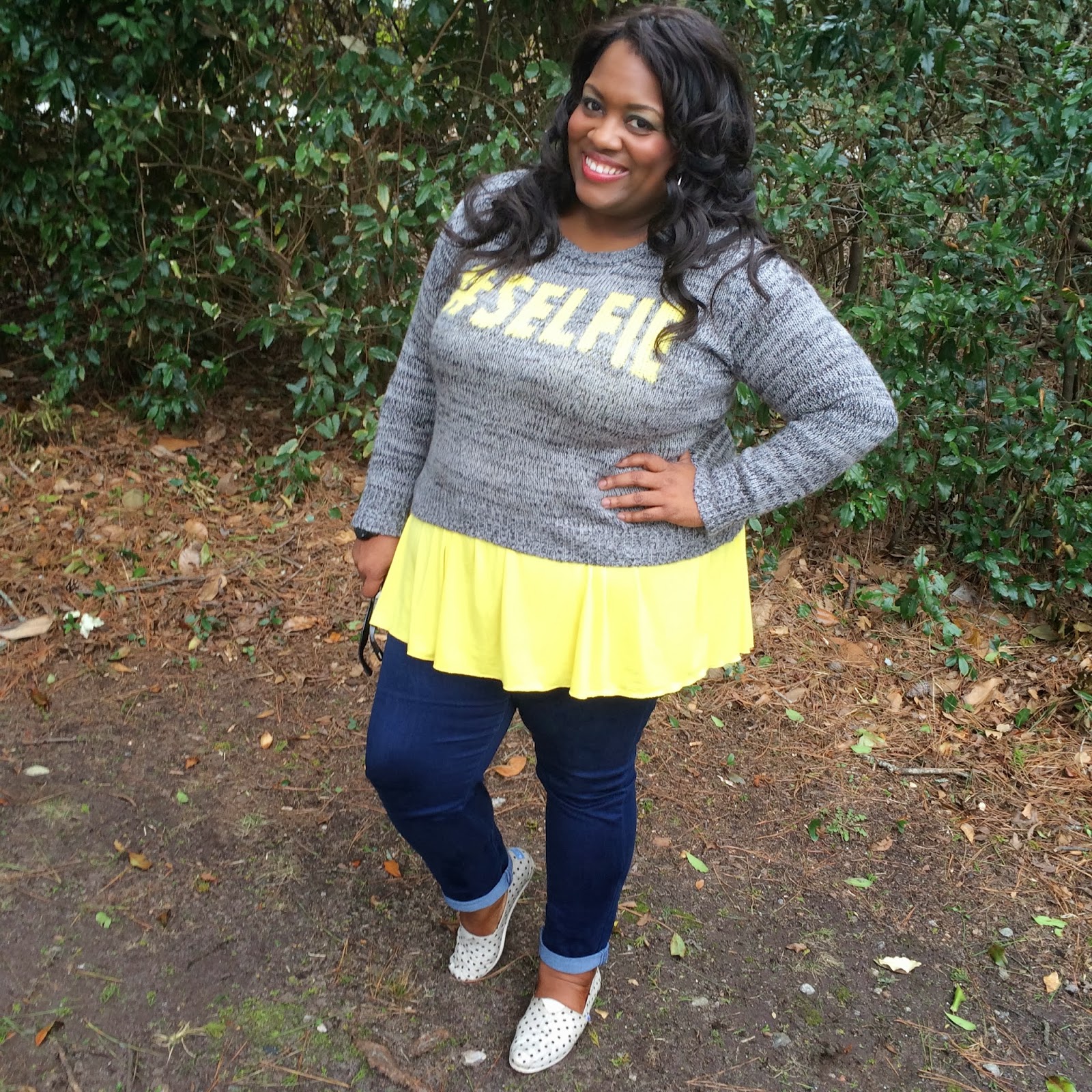 I know you're probably thinking you can't layer with the Pretty cami because it has so much volume, but you couldn't be more wrong. As you already know, I have a little problem area that I like to call LHF (low hanging fat). Because of this LHF, I usually stay away from super fitted tops if I am wearing pants or jeans. For this look, I used my Pretty cami to layer under my #SELFIE sweater from Target. It created almost a peplum effect and perfectly covered my LHF in my SWAK jeans. I decided to roll the cuff a little lower and added my polka-dot TOMS to finish up the look. This look would be great for running errands but is still put together enough that you could still have a casual meeting with a client.